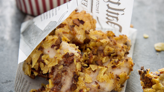 Paner les gigolettes en les enduisant de farine, puis d’oeufs battus puis en les recouvrant de chips concassées.