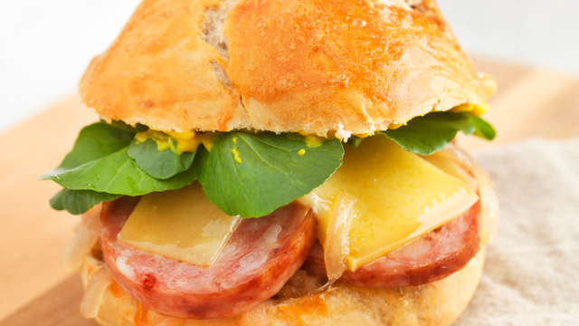 Couper la saucisse en 16 tranches assez fines, puis couper les bun's en deux : sur chaque partie inférieure, déposer l'oignon confit, quelques lamelles de Comté, 2 tranches de saucisse et de nouveau des lamelles de Comté. Passer au four quelques minutes afin de faire fondre le Comté.