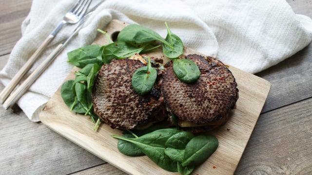 On ose un burger sans pain, où la viande entoure les autres ingrédients. Comme une sorte de steak farci à déguster avec couteau et fourchette, comme plat.