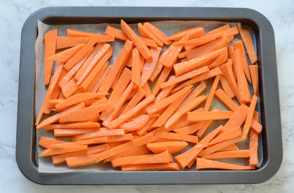 Disposez les frites de patates douce dans une plaque recouverte de papier sulfurisé.