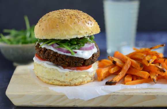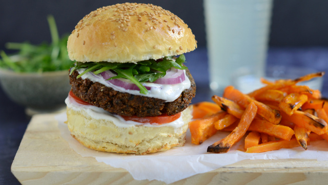 Un burger végétarien avec pleines de saveurs où le steak haché est remplacé par un steak aux pois chiches aux influences libanaises puis des frites de patates douces au four pour compléter cette gourmandise.