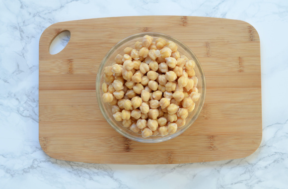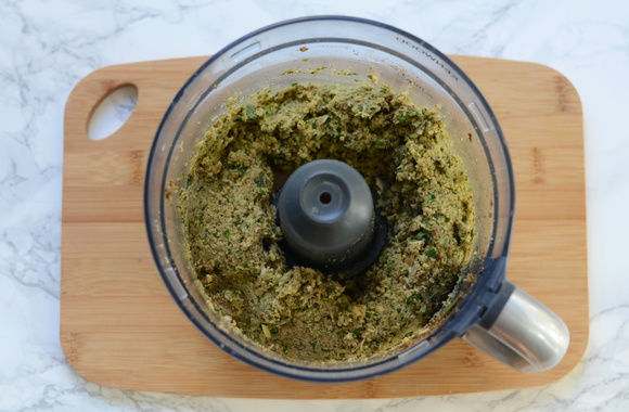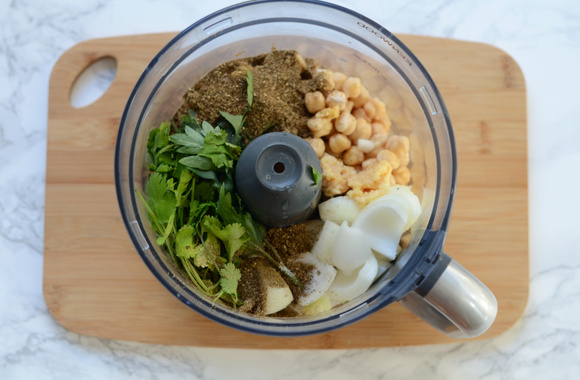 3Hachez grossièrement l'oignon et l'ail, et mettez-les au robot avec les pois chiches, le persil et la coriandre.