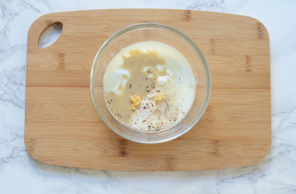 7Dans un bol, mélangez le yaourt grec avec le tahiné, le jus de citron, l'huile d'olive, l'ail haché, le sel et le poivre.