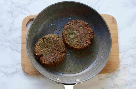6Chauffez l'huile de friture dans une poêle et faites cuire les steaks aux pois-chiches des deux côtés jusqu'à ce qu'ils soient bien dorés.