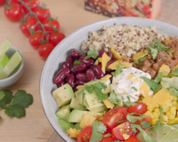 Dans un grand bol, dressez d'abord le quinoa cuit puis disposez tout autour la viande hachée, le maïs, les haricots rouges, l'avocat et les tomates cerise. Mettez au milieu la crème fraîche, les feuilles de coriandre et des quartiers de citron vert. Dégustez.