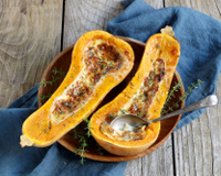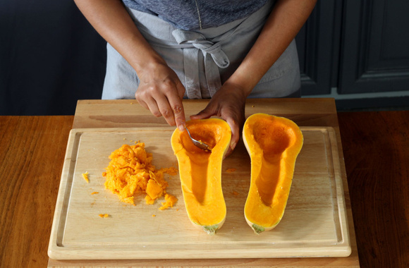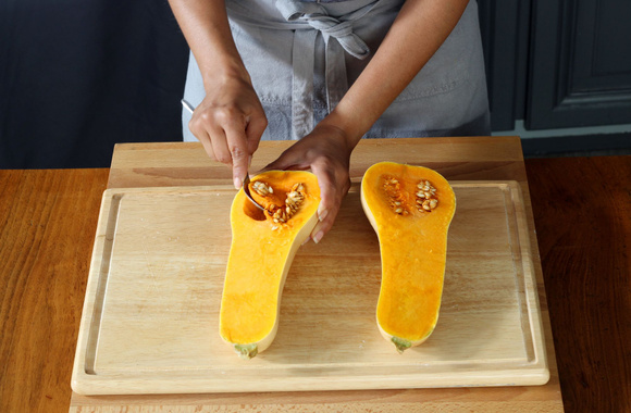3Ôtez les graines. Agrandissez un peu la cavité des deux morceaux du butternut en creusant avec une cuillère à soupe. Gardez au frigo la chair enlevée pour une future soupe.
