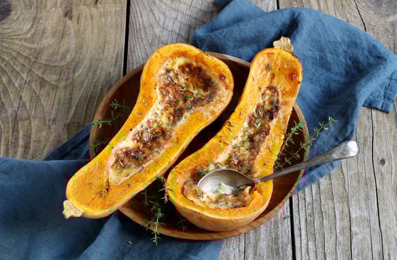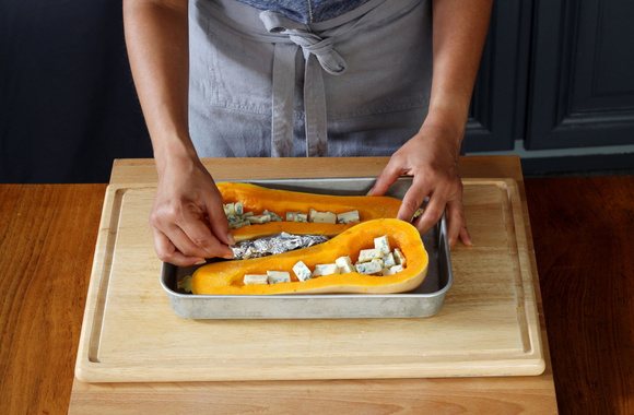 5Déposez les demi-butternuts sur une plaque de cuisson ou un plat à gratin. Déposez les dés de fourme d'Ambert à l'intérieur de chaque morceau de butternut.