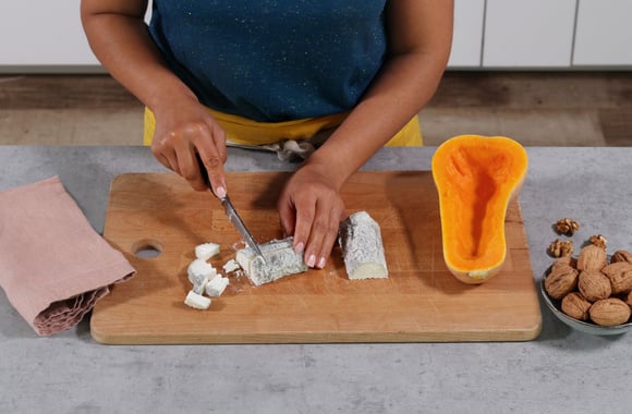 5Coupez la bûche de chèvre cendrée en dés.