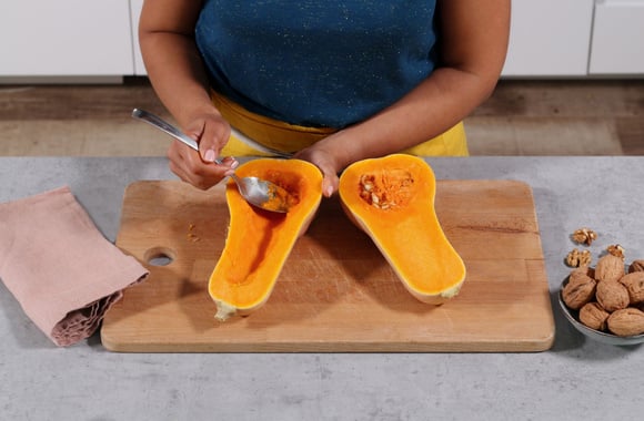 1Nettoyez la courge Butternut et coupez-la en deux, ôtez les graines.