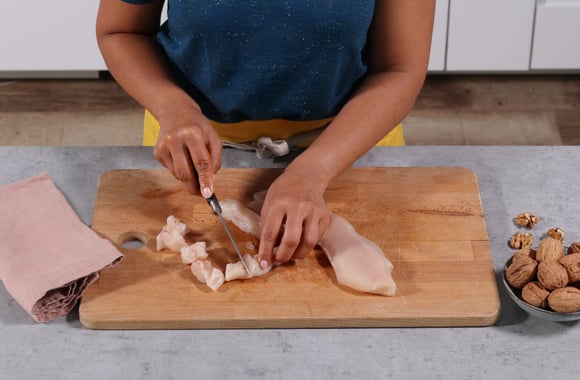 2Coupez les filets de poulet en petits dés.