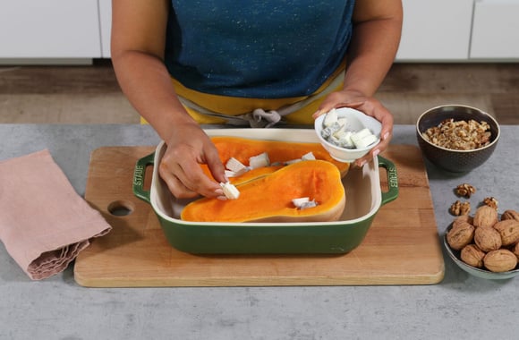 Déposez les dés de fromage à l’intérieur de chaque morceau de Butternut.