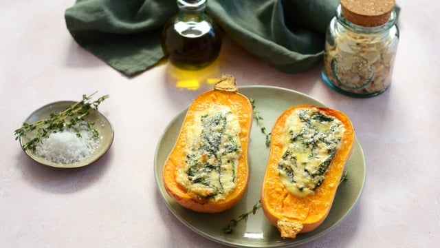 Garnissez les courges butternut avec la préparation et saupoudrez-les de parmesan râpé.