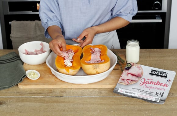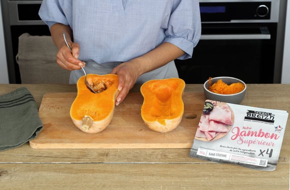 Nettoyez la courge Butternut et coupez-la en deux, ôtez les graines. Agrandissez un peu la cavité des deux morceaux de courge en creusant avec une cuillère à soupe. Gardez au frigo la chair enlevée pour une future soupe.