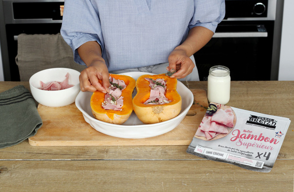 8Versez la crème liquide sur la garniture, jusqu’à ras-bord. Enfournez pour 1h à 1h30, selon la taille de la courge.