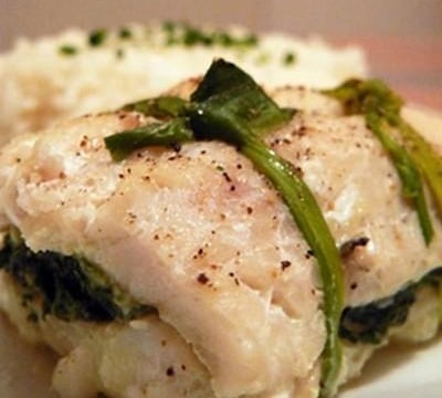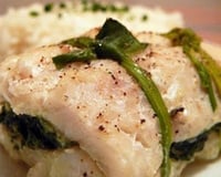 Couper en deux les filets de cabillaud et couvrir d'épinards le premier filet puis poser le deuxième filet par dessus. Ficeler les deux filets, avec une partie du poireau.