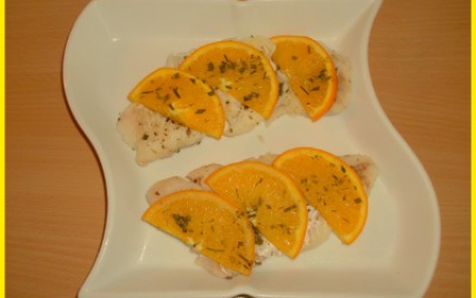 Coupez l'orange en tranches puis coupez-les en deux et déposez-les sur les filets de cabillaud.