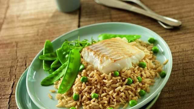 Réchauffez le riz selon les informations de cuisson au dos du paquet. Servez le poisson accompagné du riz et de ses légumes. Salez et poivrez.