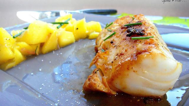 Saveurs et couleurs. Légèreté et simplicité. Un dos de cabillaud rôti et déglacé au vinaigre de mangues avec quelques mangues caramélisées.