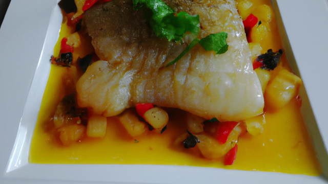 Un dos de cabillaud servi sur une crème de lentilles parfumée au curry et une poêlée de roquette accompagnée d'un nems de coriandre.