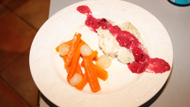 Dressez et nappez votre poisson de la sauce griotte. Salez et poivrez à votre convenance.