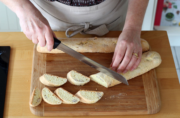 8Attendez 5 minutes puis coupez les boudins encore tièdes en tranches biseautées d'1,5 cm.