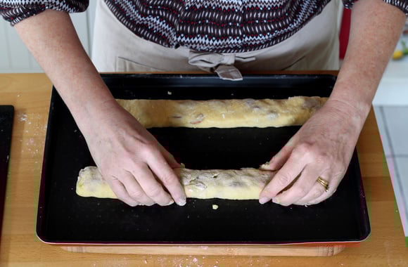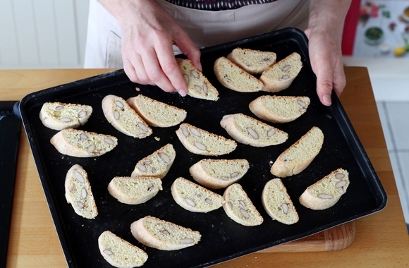 9Baissez le four à 150°C puis enfournez les cantuccini pendant une vingtaine de minutes, en les retournant à mi-cuisson. Ils doivent être dorés et bien fermes au toucher.
