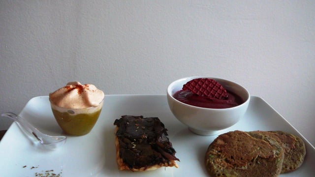 Déguster la mousse de betterave, puis le cappuccino de courgettes potimarron, les blinis et enfin la petite tarte tatin... dans cet ordre pour un plus grand plaisir en bouche !