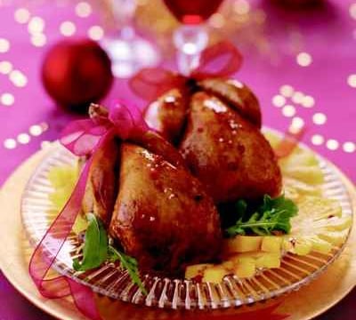 Dresser les cailles sur un plat chaud et verser l'ananas et le jus très chaud.