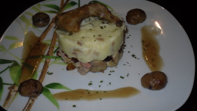 Cailles confites aux agrumes, raisins et lardons surmontées de purée de pommes de terre aux éclats de marrons