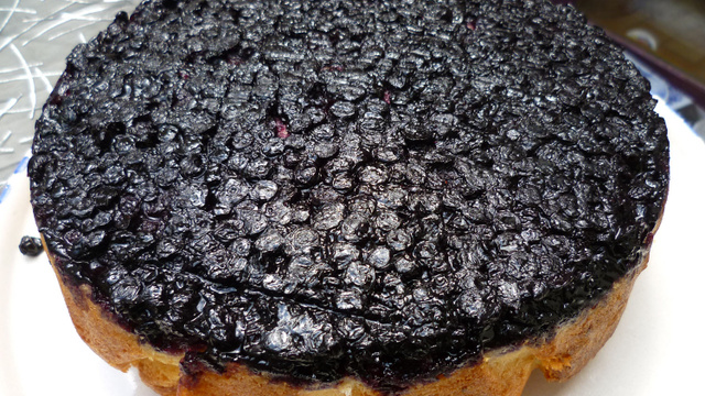 Une fois le gâteau cuit, laisser-le dehors 5 minutes puis le démouler en posant une assiette sur le gâteau et en le retournant de manière à avoir les myrtilles au dessus. - 6