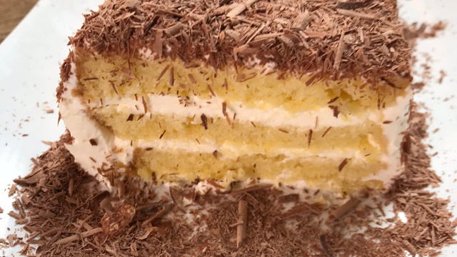 Tassez légèrement le tout. Couvrez de film alimentaire puis mettez au frais pendant au moins 2 heures. Démoulez le cake sur un plat de service en prenant soin de retirer le film. Masquez le cake avec le reste de la chantilly puis saupoudrez de copeaux de chocolat.