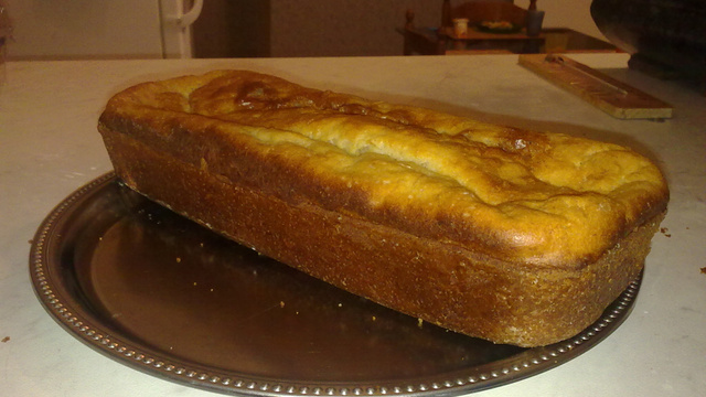 Beurrer le moule, mettre la moitié de la pâte, dispose le fromage le long du cake, recouvrir du reste de la pâte