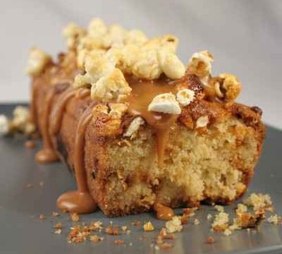 Versez le caramel sur le cake et parsemez du reste de pop corn.