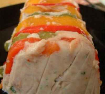 Recouvrez de film alimentaire l'intérieur d'un grand moule à cake. Disposez les lanières de poivrons sur le fond en alternant les couleurs.
