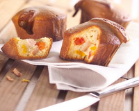 Préchauffer le four à 210°C (thermostat 6). Mélanger la farine et la levure dans un saladier. Au centre ajouter les oeufs et mélanger peu à peu en incorporant le lait et l'huile.