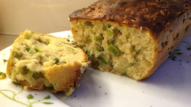 Ajoutez 200g de farine, un demi-sachet de levure, puis les petits pois et les dés de courgettes.