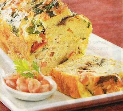 Incorporez la mozzarella, le saumon fumé et les crevettes à la pâte, salez et poivrez. Versez la préparation dans un moule à cake antiadhésif non graissé en intercalant les dés de légumes. Mettez au four pendant 45 min. Démoulez froid.
