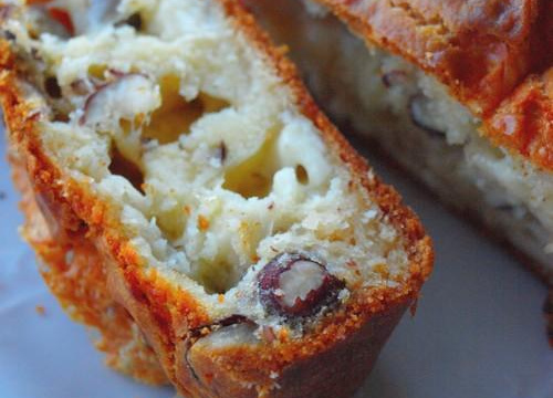 Ajoutez le fromage coupé en dès et les noisettes, versez la pâte dans un poule à cake tapissé de papier sulfurisé ou en silicone, enfournez 30 min.