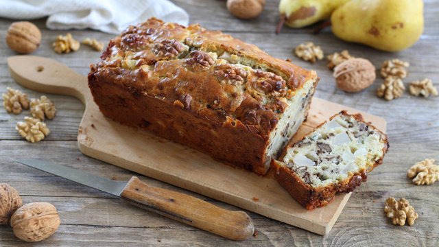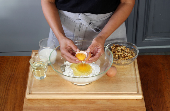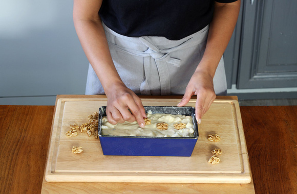 7Versez l'appareil dans un moule à cake beurré et fariné puis parsemez avec quelques cerneaux de Noix du Périgord AOP.