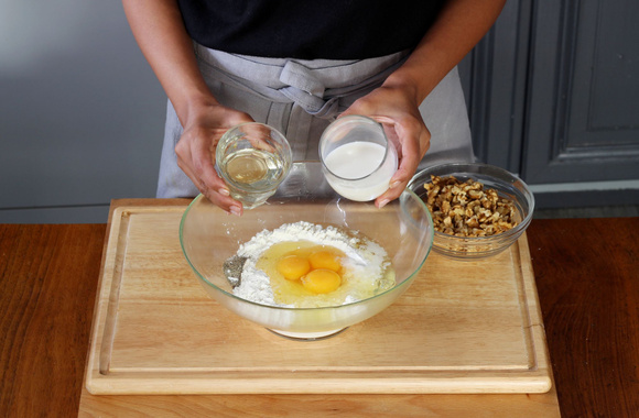 4Ajoutez l'huile et le lait. Mélangez jusqu'à obtenir une pâte lisse et homogène.