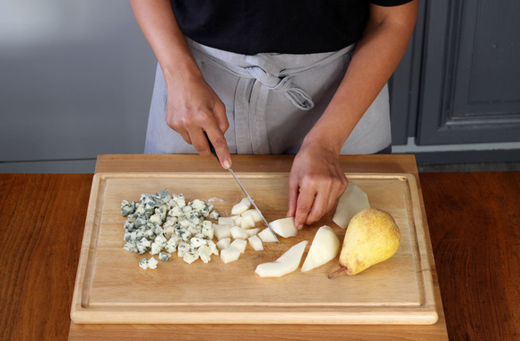 Coupez le roquefort en petits dés, épluchez les poires et coupez-les en dés.