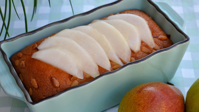 Sortez le cake du four et laissez refroidir avant de le démouler. Décorez avec les tranches de poire...
