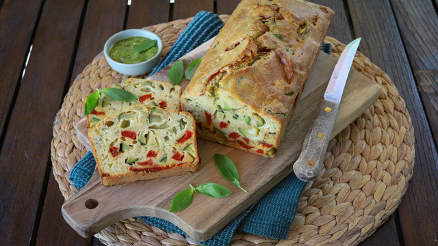 Un cake aux poivrons, pesto et courgettes, ensoleillé et plein de saveurs. Facile à préparer, il est parfait pour l'apéritif, pour un pique-nique et même pour un buffet dînatoire.