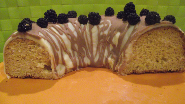 Utilisation de la courge musquée pour la réalisation d'un mixte entre génoise et cake, le tout recouvert d'un glaçage chocolat blanc et chocolat au lait, agrémenté des dernières mûres du jardin.
