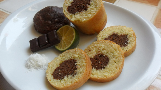 Cake aromatisé aux zestes,au jus de citron vert et a la noix de coco avec un coeur au chocolat cuit dans un moule cylindrique