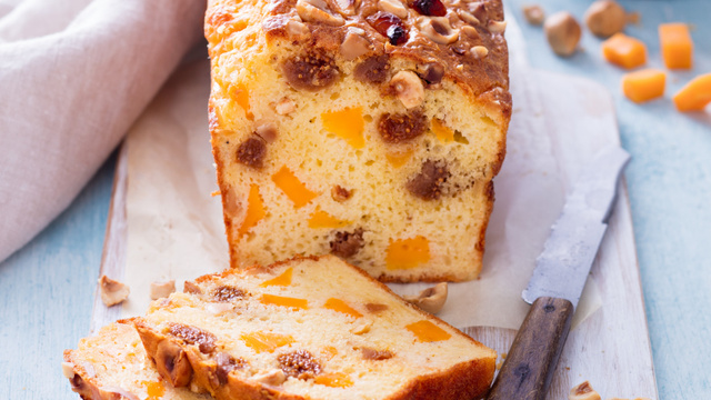 Réalisez la pâte à cake : mélangez à l’aide d’un fouet le contenu d’un sachet de Préparation pour cake salé MAIZENA® avec 25 cl d'eau et 10 cl de crème liquide entière. Ajoutez 100 g de fromage râpé, la mimolette et les fruits secs en gardant quelques noisettes que vous parsèmerez sur le dessus du cake avant de l’enfourner.