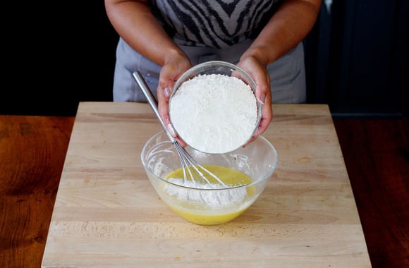 5Ajoutez 3 pots à yaourt de farine et la levure chimique. Mélangez à nouveau.