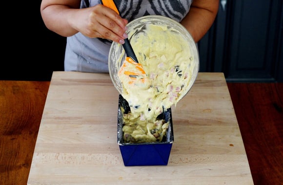 9Versez la pâte dans le moule à cake puis tapotez le moule à cake sur le plan de travail pour égaliser la pâte.