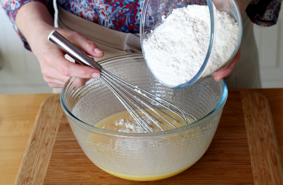 3Ajoutez la farine, la levure et mélangez juste assez pour ne plus voir la farine.