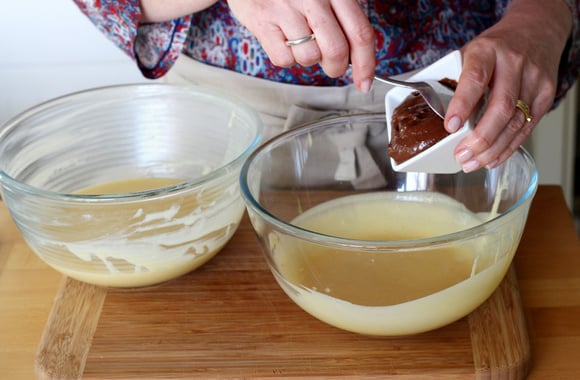 5Séparez la pâte dans deux bols, en mettant un peu moins de pâte dans le premier bol. Ajoutez le Nutella dans le premier bol.
